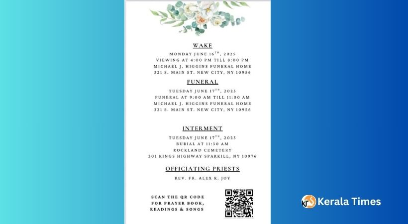 കാതറിനിന്റെ മൃതദേഹം ജൂൺ 16 തിങ്കളാഴ്ച വൈകിട്ട് 4 മണി മുതൽ 8 മണിവരെയുള്ള സമയം ന്യൂ സിറ്റിയിലെ മൈക്കൽ ജെ ഹിഗ്ഗിൻസ് ഫ്യൂണറൽ ഹോമിൽ പൊതുദർശനം. തുടർന്ന്, ജൂൺ 17 ചൊവ്വാഴ്ച രാവിലെ 9 മണി മുതൽ 11 മണിവരെയുള്ള സമയം റവ. ഫാ. അലക്സ് കെ ജോയി സാന്നിധ്യത്തിൽ കർത്തൃഭക്തിപൂർവ്വം യാത്രയാക്കും. സംസ്ക്കാരം റോക്ക്ലാന്റ് സെമിത്തേരിയിൽ നടക്കും.