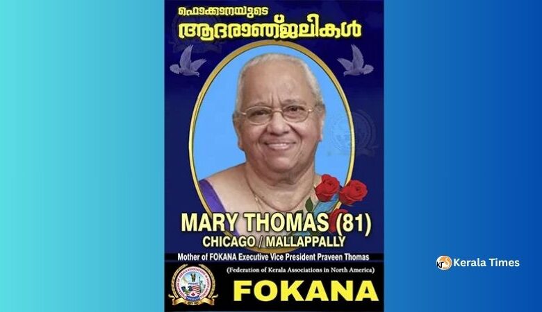 മേരി തോമസിന്റെ നിര്യാണത്തില് ഫൊക്കാന അനുശോചനം രേഖപ്പെടുത്തി. പ്രവീണ് തോമസിനെയും കുടുംബത്തെയും ആശ്വസിപ്പിച്ചുകൊണ്ട് പരേതയുടെ ആത്മാവിന് നിത്യശാന്തി ലഭിക്കണമെന്ന് പ്രാര്ത്ഥിക്കുന്നു എന്ന് ഫൊക്കാന പ്രസിഡന്റ് സജിമോന് ആന്റണി, സെക്രട്ടറി ശ്രീകുമാര് ഉണ്ണിത്താന്, ട്രഷറര് ജോയി ചാക്കപ്പന്, വൈസ് പ്രസിഡന്റ് വിപിന് രാജു, ജോയിന്റ് സെക്രട്ടറി മനോജ് ഇടമന, ജോയിന്റ് ട്രഷറര് ജോണ് കല്ലോലിക്കല്, അഡിഷണല് ജോയിന്റ് സെക്രട്ടറി അപ്പുകുട്ടന് പിള്ള, അഡിഷണല് ജോയിന്റ് ട്രഷറര് മില്ലി ഫിലിപ്പ്, വിമന്സ് ഫോറം ചെയര്പേഴ്സണ് രേവതി പിള്ള, ട്രസ്റ്റി ബോര്ഡ് ചെയര്മാന് ജോജി തോമസ്, ഫൊക്കാന നാഷണല് കമ്മിറ്റി അംഗങ്ങള്, ട്രസ്റ്റി ബോര്ഡ് അംഗങ്ങള് എന്നിവര് അറിയിച്ചു.