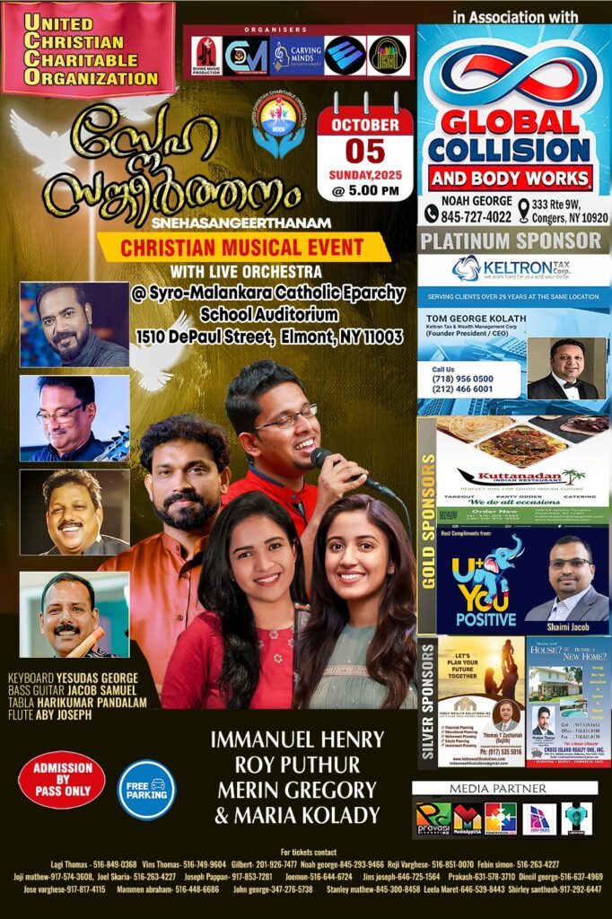 “സ്നേഹ സങ്കീർത്തനം” എന്ന ഈ സംഗീത നിശ എൽമൻഡിലുള്ള മലങ്കര കാത്തോലിക് സ്കൂൾ ഓഡിറ്റോറിയത്തിൽ (1510 DePaul St, Elmont, NY) വച്ചാണ് നടത്തപ്പെടുന്നത്. ഗായകരായ ഇമ്മാനുവൽ ഹെൻറി, റോയി പുത്തൂർ, മെറിൻ ഗിഗ്രറി, മരിയ കോലടി കൂടാതെ കേരളത്തിൽ അറിയപ്പെടുന്ന ഓർക്കസ്ട്ര ടീം ഈ മ്യൂസിക്കൽ ഈവൻ്റ് മികവുറ്റതാക്കും. വ്യത്യസ്ത നിറഞ്ഞ ഈ ഗാന സദ്യയിലേക്ക് ഏവരെയും സ്വാഗതം ചെയ്യുന്നു.