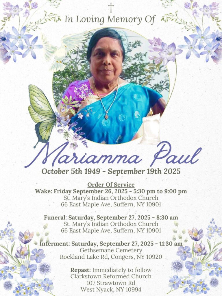 പൊതുദർശനം : 2025 സെപ്റ്റംബർ 26 വെള്ളിയാഴ്ച – വൈകുന്നേരം 5:30 മുതൽ രാത്രി 9:00 വരെ സെന്റ് മേരീസ് ഇന്ത്യൻ ഓർത്തഡോക്സ് ചർച്ച് 66 ഈസ്റ്റ് മേപ്പിൾ അവന്യൂ, സഫേൺ, ന്യൂയോർക്ക് 10901,ശവസംസ്കാരം ചടങ്ങുകൾ : ശനിയാഴ്ച, സെപ്റ്റംബർ 27, 2025 ,സെന്റ് മേരീസ് ഇന്ത്യൻ ഓർത്തഡോക്സ് ചർച്ച് 66 ഈസ്റ്റ് മേപ്പിൾ അവന്യൂ, സഫേൺ, ന്യൂയോർക്ക് 10901