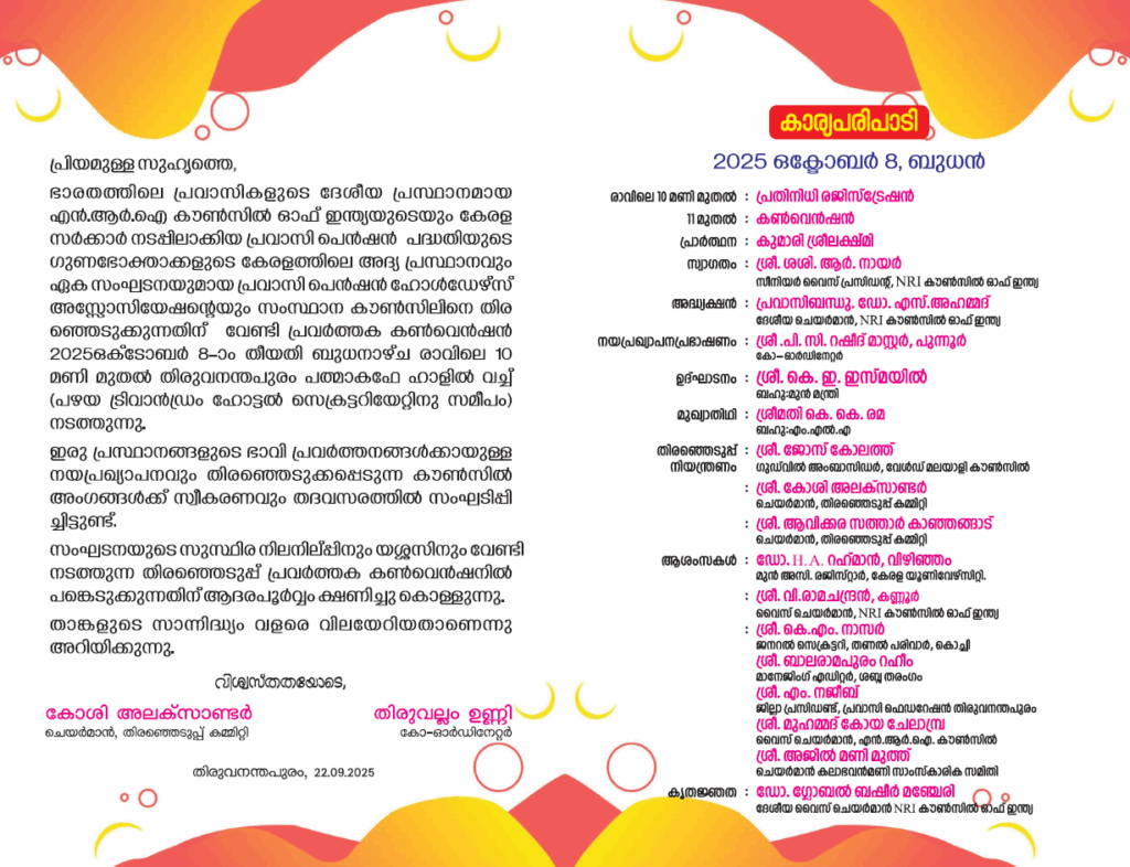 തിരുവനന്തപുരം:പ്രവാസി ഇന്ത്യൻ സമൂഹത്തിന്റെ ശബ്ദമായി പ്രവർത്തിക്കുന്ന എൻ.ആർ.ഐ. കൗൺസിൽ ഓഫ് ഇന്ത്യയുടെ നേതൃത്വത്തിൽ, കേരളത്തിൽ പ്രവാസി പെൻഷൻ പദ്ധതിയുടെ ഗുണഭോക്താക്കളെ ഏകോപിപ്പിക്കുന്ന പ്രവാസി പെൻഷൻ ഹോൾഡേഴ്സ് അസ്സോസിയേഷൻ (PPHA) സംയുക്തമായി സംഘടിപ്പിക്കുന്ന സംസ്ഥാന പ്രവർത്തക കൺവെൻഷൻ 2025, ഒക്ടോബർ 8-ാം തീയതി ബുധനാഴ്ച രാവിലെ 10 മണിക്ക്, തിരുവനന്തപുരം പത്മാകഫേ ഹാളിൽ (പഴയ ട്രിവാൻഡ്രം ഹോട്ടൽ, സെക്രട്ടറിയേറ്റ് സമീപം) നടക്കും.