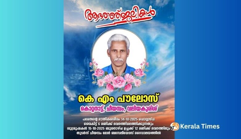 കൊറ്റനാട്, ചീയമ്പം, വലിയകുരിശ് സ്വദേശിയായ കെ.എം. പൗലോസ് അന്തരിച്ചു. പരേതന്റെ ഭൗതികശരീരം ഒക്ടോബർ 14 ചൊവ്വാഴ്ച വൈകിട്ട് ആറുമണിക്ക് ഭവനത്തിലെത്തിക്കും. ശുശ്രൂഷകൾ ഒക്ടോബർ 15 ബുധനാഴ്ച ഉച്ചയ്ക്ക് പന്ത്രണ്ടുമണിക്ക് ഭവനത്തിലും തുടർന്ന് ചീയമ്പം മോർ ബസേലിയോസ് ദൈവാലയത്തിലും നടക്കും.