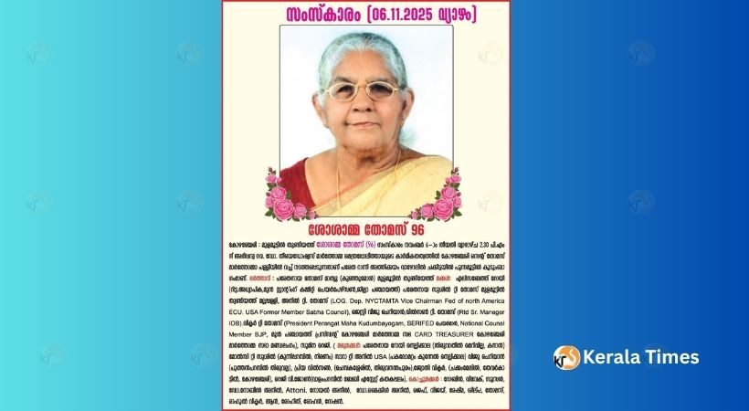 ന്യൂയോർക്ക് : മാർത്തോമ്മ സഭയുടെ നോർത്ത് അമേരിക്കയിൽ നിന്നുള്ള മുൻ സഭാ കൗൺസിൽ അംഗവും, എക്യുമെനിക്കൽ ഫെഡറേഷൻ ഓഫ് നോർത്ത് അമേരിക്കയുടെ വൈസ് ചെയർമാനുമായ അനിൽ ടി. തോമസ് മുളമൂട്ടിലിന്റെ മാതാവ് ശോശാമ്മ തോമസ് (96) നിര്യാതയായി. കോഴഞ്ചേരി മുളമൂട്ടിൽ തുണ്ടിയത്ത് പരേതനായ തോമസ് മാത്യുവിന്റെ ഭാര്യയാണ്. റാന്നി അത്തിക്കയം വാഴോലിൽ ചക്കിട്ടയിൽ പുന്നമൂട്ടിൽ കുടുംബാംഗവുമാണ്.