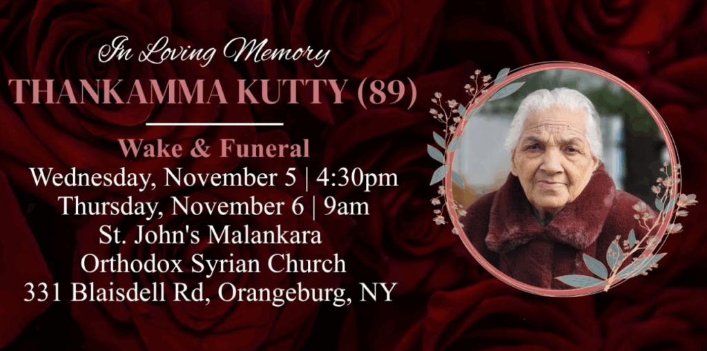 ന്യൂയോർക്ക് : അജി കളീക്കലിന്റെ മാതാവായ തങ്കമ്മ കുട്ടി (89) അന്തരിച്ചു. കുടുംബത്തോടൊപ്പം അമേരിക്കയിൽ താമസിച്ചു വരികയായിരുന്നു.
