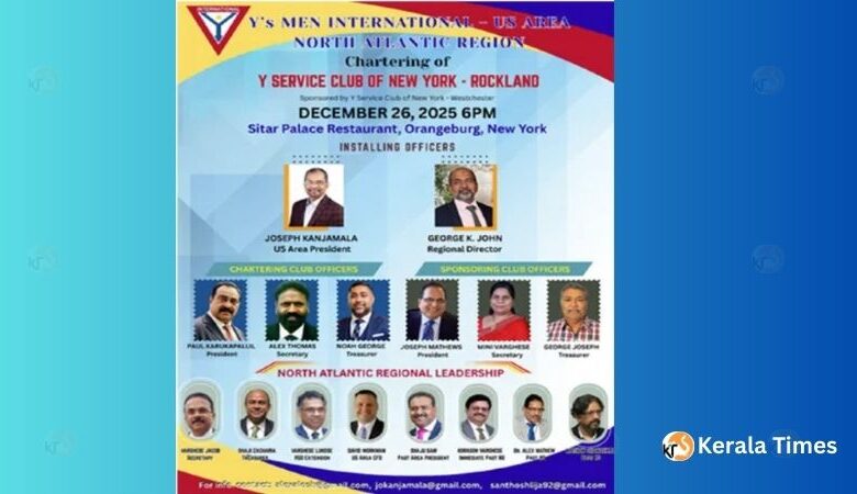 ‘വൈ സർവീസ് ക്ലബ് ഓഫ് ന്യൂയോർക്ക്–റോക്ലാൻഡ്’ ഡിസംബർ 26, 2025-ന് ചാർട്ടർ ചെയ്യപ്പെടും. ഓറഞ്ച്ബെർഗിലെ സിത്താർ പാലസ് റെസ്റ്റോറന്റിൽ വൈകുന്നേരം ആറിന് നടക്കുന്ന ചടങ്ങിൽ പോൾ കറുകപ്പള്ളി ക്ലബ്ബ് പ്രസിഡന്റായും, അലക്സ് തോമസ് സെക്രട്ടറിയായും, നോഹ ജോർജ് ട്രഷററായും ചുമതലയേൽക്കും. യുഎസ് ഏരിയ പ്രസിഡന്റ് ജോസഫ് കാഞ്ഞമലയും നോർത്ത് അറ്റ്ലാന്റിക് റീജിയൻ ഡയറക്ടർ ജോർജ് കെ. ജോണും ചേർന്ന് പുതിയ ഭാരവാഹികൾക്ക് ഔദ്യോഗികമായി ചുമതലകൾ ഏൽപ്പിക്കും.