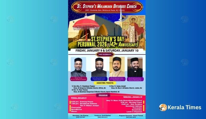 ന്യൂജേഴ്‌സി : മിഡ് ലാൻഡ്‌ പാർക്ക്‌ സെന്റ്‌ സ്റ്റീഫൻസ് ഓർത്തഡോൿസ്‌ ദേവാലയത്തിൽ വിശുദ്ധ സ്തെപ്പാനോസ് സഹദായുടെ തിരുനാൾ ആഘോഷ ചടങ്ങുകൾ ജനുവരി 9,10 (വെള്ളി /ശനി ) തീയതികളിൽ ക്രമീകരിച്ചിരിക്കുന്നു . ദേവാലയത്തിന്റെ നാല്പത്തിരണ്ടാം വാർഷികാഘോഷവും തിരുനാൾ ചടങ്ങുകളുടെ ഭാഗമായി ഒരുക്കിയിട്ടുണ്ട്