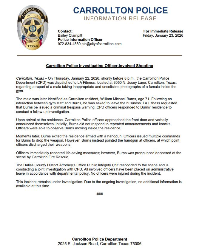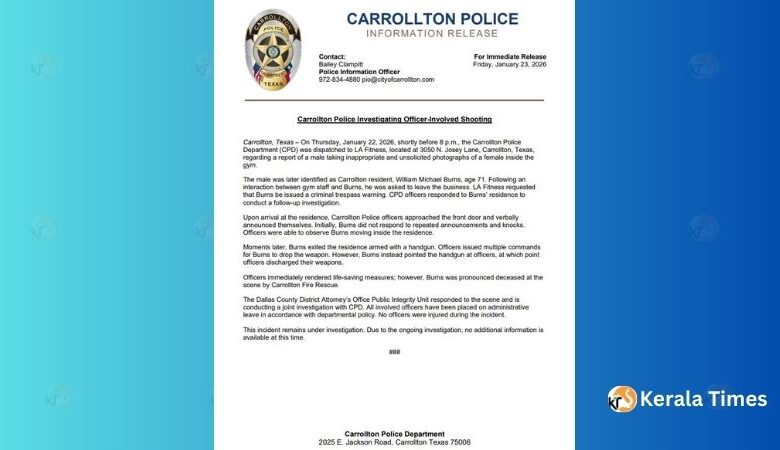 കരോൾട്ടൺ: ജിമ്മിൽ വെച്ച് സ്ത്രീയുടെ ചിത്രം പകർത്തിയ 71 വയസ്സുകാരനെ പോലീസ് വെടിവച്ചു കൊന്നു.