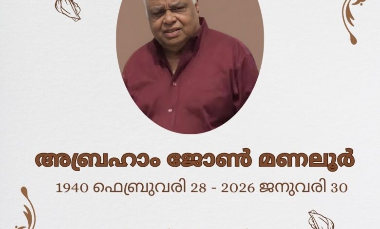 ഡാളസ് (ടെക്സാസ് ): മണലൂർ കുടുംബാംഗം അബ്രഹാം ജോൺ മണലൂർ (85) ഡാലസിൽ അന്തരിച്ചു വാർദ്ധക്യസഹജമായ കാരണങ്ങളാൽ 2026 ജനുവരി 30 വെള്ളിയാഴ്ചയായിരുന്നു അന്ത്യം.ഡാളസ് സെഹിയോൻ മാർത്തോമാ ചർച് അംഗമാണ്