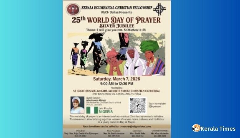 ഡാളസ് : കേരള എക്യുമെനിക്കൽ ക്രിസ്ത്യൻ ഫെല്ലോഷിപ്പ് ഡാലസിന്റെ ആഭിമുഖ്യത്തിൽ 25-ാമത് ലോക പ്രാർത്ഥനാ ദിനവും സിൽവർ ജൂബിലി ആഘോഷങ്ങളും സംഘടിപ്പിക്കുന്നു. 2026 മാർച്ച് 7 ശനിയാഴ്ച രാവിലെ 9:00 മുതൽ ഉച്ചയ്ക്ക് 12:30 വരെ കാരൾട്ടണിലുള്ള സെന്റ് ഇഗ്നേഷ്യസ് മലങ്കര യാക്കോബായ സുറിയാനി ക്രിസ്ത്യൻ കത്തീഡ്രലിൽ വെച്ചാണ് (2707 Dove Creek Ln, Carrollton, TX 75006) ഈ പ്രാർത്ഥനാ സംഗമം നടക്കുന്നത്.