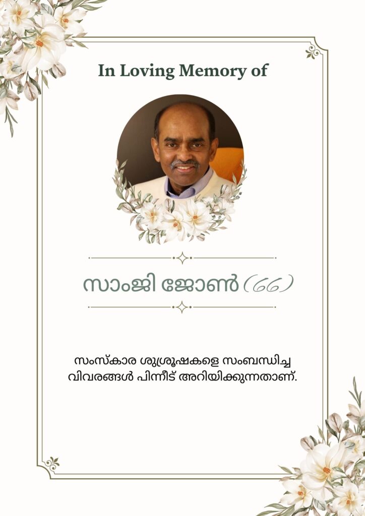 വാൻകൂവർ(കാനഡ): സെന്റ് തോമസ് മാർത്തോമ്മാ ഇടവകാംഗം സാംജി ജോൺ (66) വാൻകൂവറിൽ മാർച്ച് 16 തിങ്കളാഴ്ച പുലർച്ചെ വാൻകൂവറിൽ(കാനഡ) അന്തരിച്ചു.
