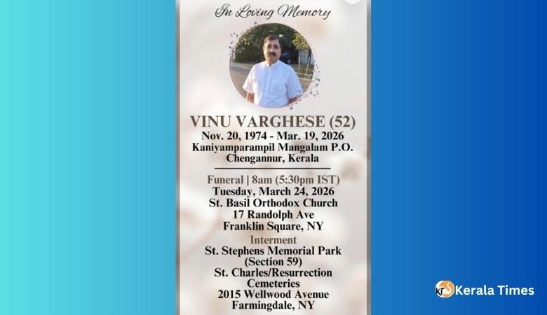 ചെങ്ങന്നൂർ: കണിയാമ്പരമ്പിൽ മംഗലം പി.ഒ., ചെങ്ങന്നൂർ സ്വദേശിയായ വിനു വർഗീസ് (52) അന്തരിച്ചു. മാർച്ച് 19, 2026-നാണ് മരണം സംഭവിച്ചത്. അമേരിക്കയിലെ ന്യൂയോർക്കിലെ ഫ്രാങ്ക്ലിൻ സ്ക്വയറിൽ താമസിച്ചു വരികയായിരുന്നു