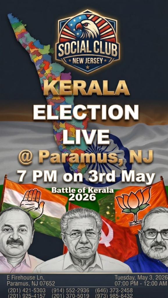ന്യൂ ജേഴ്സി സോഷ്യൽ ക്ലബിന്റെ ആഭിമുഖ്യത്തിൽ കേരളാ ഇലക്ഷൻ റിസൾട്ട് വാച്ച് നൈറ്റ് ലൈവ് മെയ് 3 ന് വൈകുന്നേരം 7 മണിക്ക്.