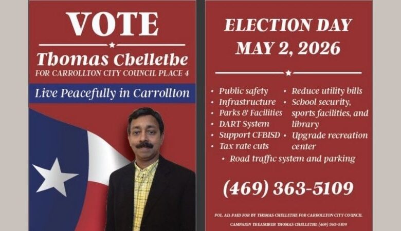 കരോൾട്ടൺ (ടെക്സസ്): അമേരിക്കയിലെ കാരൾട്ടൺ സിറ്റി കൗൺസിലിലേക്ക് നടക്കുന്ന തിരഞ്ഞെടുപ്പിൽ പ്രമുഖ മലയാളി പൊതുപ്രവർത്തകൻ തോമസ് ചെള്ളേത്ത് മത്സരിക്കുന്നു. ഇന്ത്യൻ ക്രീക്ക് ഹോം ഓണേഴ്സ് അസോസിയേഷൻ വൈസ് പ്രസിഡന്റ് എന്ന നിലയിലും വിവിധ സാമൂഹിക സംഘടനകളിലെ സജീവ സാന്നിധ്യമായും ശ്രദ്ധേയനായ അദ്ദേഹം, നഗരത്തിന്റെ വിപുലമായ വികസന പദ്ധതികൾ മുൻനിർത്തിയാണ് ജനങ്ങളെ സമീപിക്കുന്നത്.