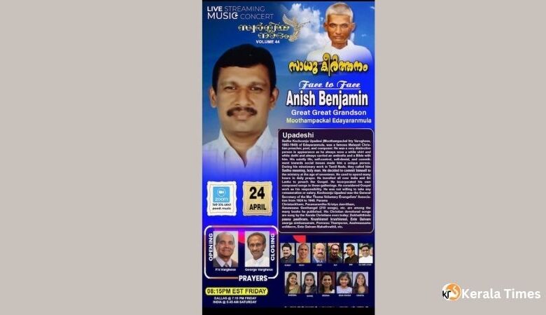 ഡാളസ് : പ്രശസ്ത ക്രൈസ്തവ പ്രസംഗകനും ഗാനരചയിതാവുമായിരുന്ന സാധു കൊച്ചുഞ്ഞ് ഉപദേശിയുടെ സ്മരണാർത്ഥം “സ്വർഗീയ നാദം” സംഘടിപ്പിക്കുന്ന ‘സാധു കീർത്തനം’ ലൈവ് സ്ട്രീമിംഗ് മ്യൂസിക് കൺസേർട്ട് ഏപ്രിൽ 24 വെള്ളിയാഴ്ച നടക്കും. സാധു കൊച്ചുഞ്ഞ് ഉപദേശിയുടെ (മൂത്തമ്പാക്കൽ ഇടയാറന്മുള) കൊച്ചുമകന്റെ മകനായ അനീഷ് ബെഞ്ചമിൻ ആണ് ഈ ‘ഫേസ് ടു ഫേസ്’ പരിപാടിയിൽ മുഖ്യാതിഥിയായി എത്തുന്നത്.