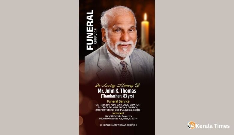പൊതുദർശനവും സംസ്കാര ശുശ്രൂഷകളും 2026 ഏപ്രിൽ 27 തിങ്കളാഴ്ച ചിക്കാഗോ മാർത്തോമ്മാ പള്ളിയിൽ (The Chicago Mar Thoma Church, 240 Potter Road, Des Plaines, IL 60016) വെച്ച് നടക്കും